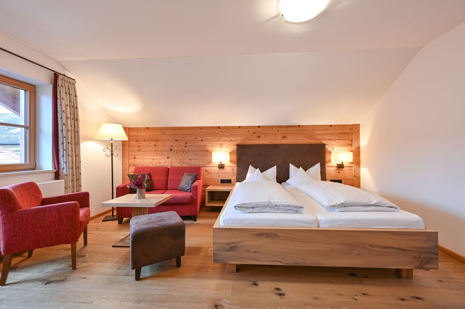 Die beiden Familienzimmer Alpin im neuen Nebenhaus erfüllen vielseitige Ansprüche: für Familien mit Kindern, Personen mit eingeschränkter Mobilität (barrierefrei) oder Wunsch nach separaten Schlafräumen. Eingerichtet im alpinen Stil haben die Schlafräume einen Rückwand aus echtem Fichtenaltholz aus der Region.