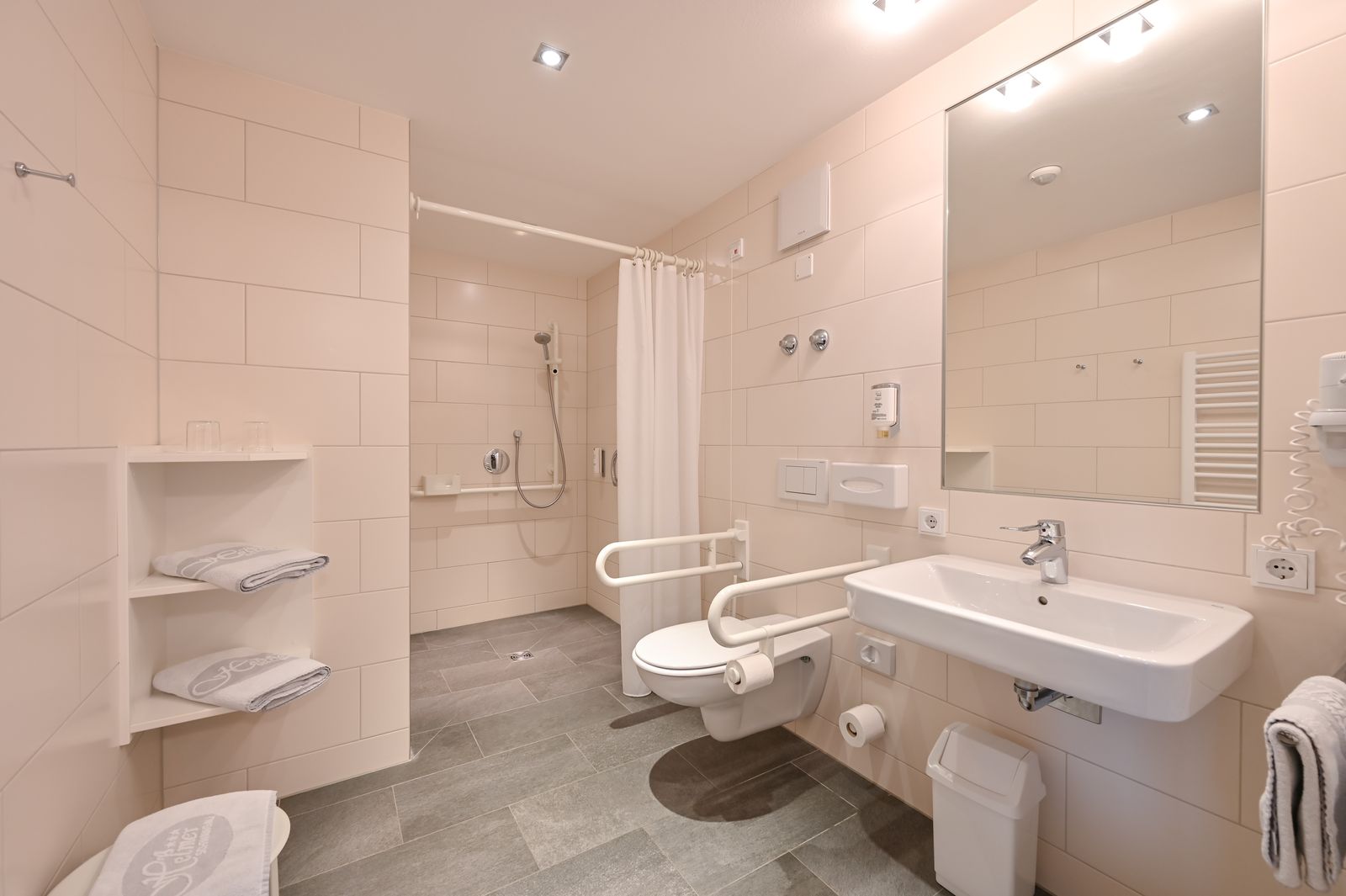 - Barrierefreie Dusche und WC mit Haltegriffen