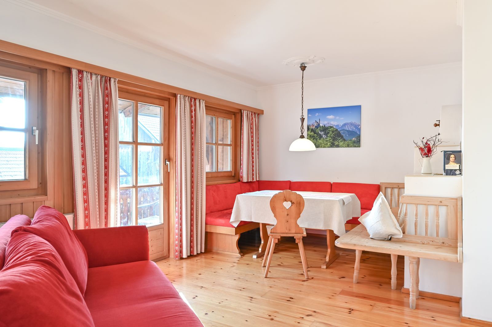 Unser größtes Familienzimmer liegt im kleinen Nebenhaus in der 1. Etage und ist besonders für Langzeitaufenthalte eignet. Es gibt zwei Schlafräume, eines mit Doppelbett und Balkon, ein weiters mit zwei Einzelbetten. Das gemütliche Wohnzimmer hat einen Fichtenholzboden und einen Balkon Richtung Mitteldorf mit Blick zum das Schloss Neuschwanstein.