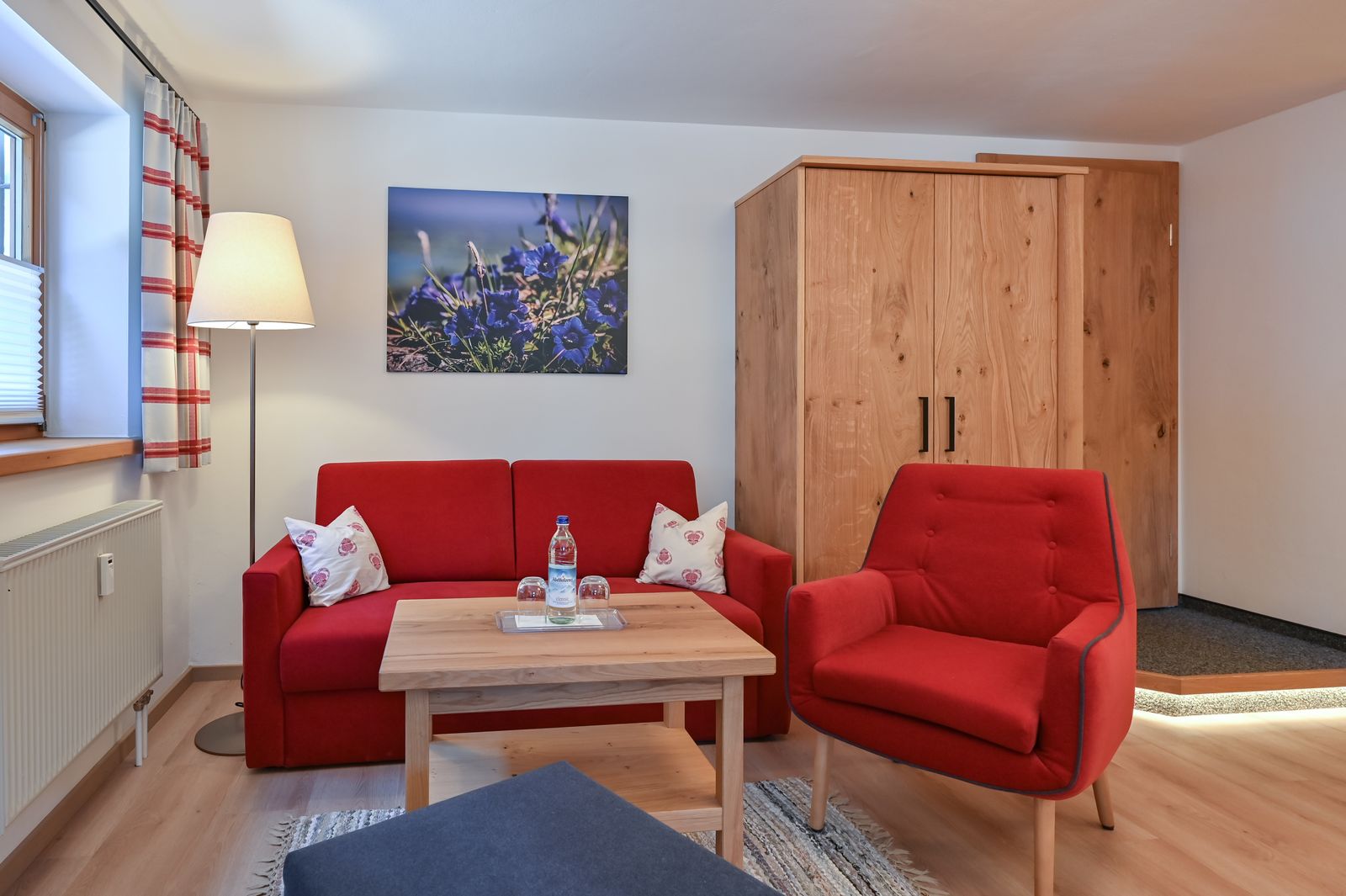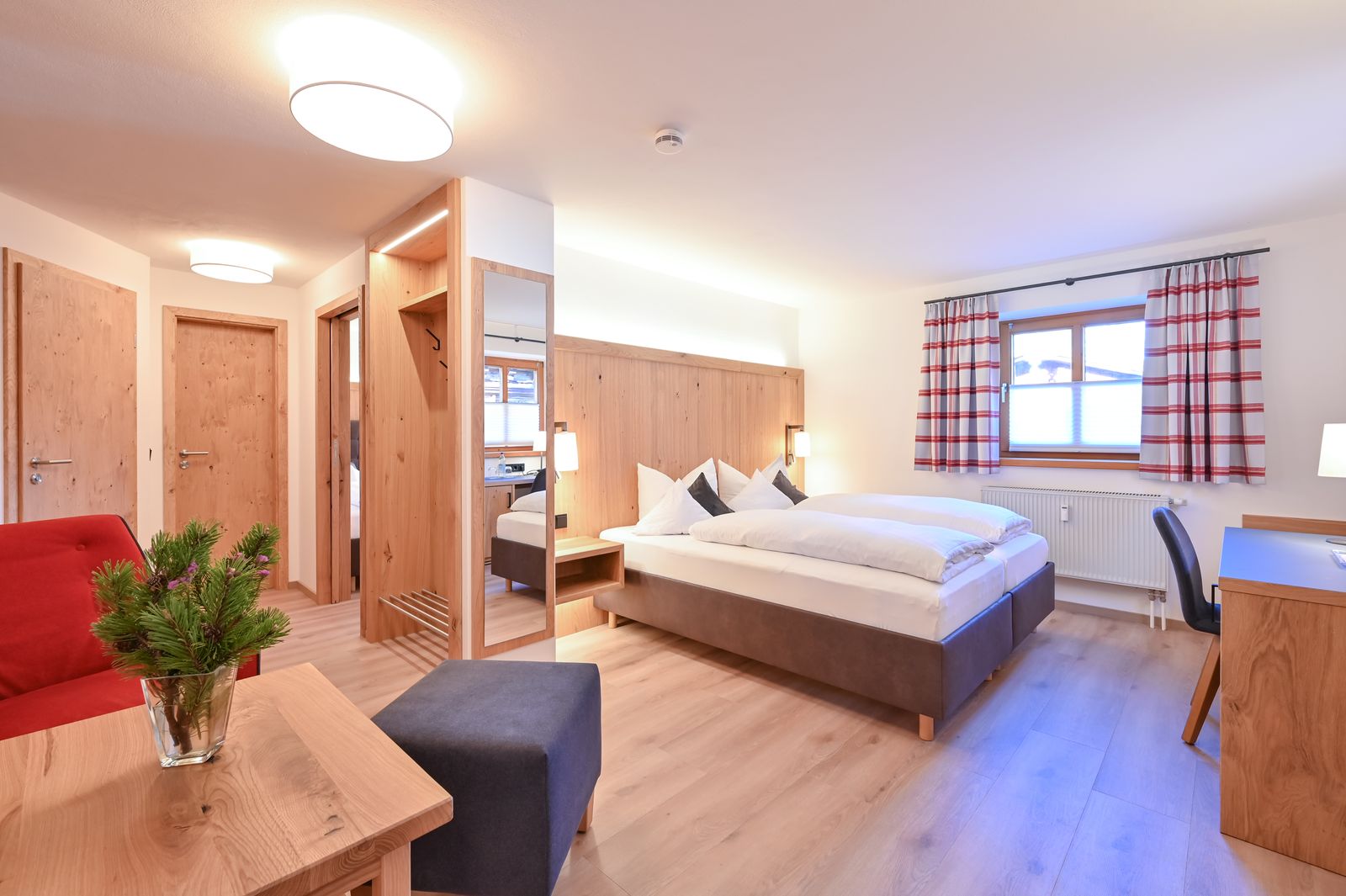 Das moderne Familienzimmer Enzian wurde 2020 neugestaltet und liegt zentral im Erdgeschoss des kleinen Nebenhauses. Es gibt einen Wohnschlafraum mit Doppelbett und ein zweites Schlafzimmer mit zwei Einzelbetten.
