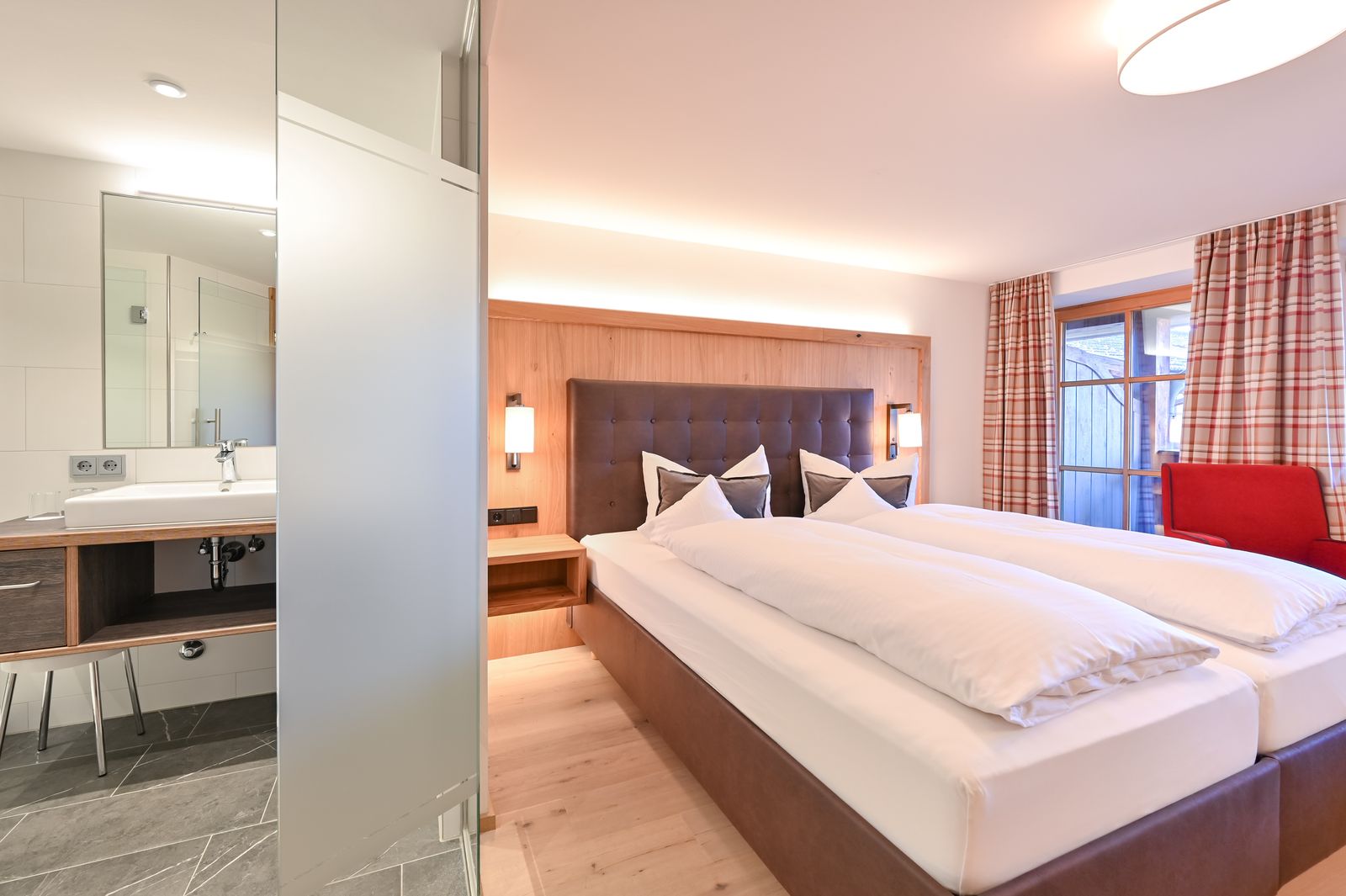 Unsere neu erstellten Doppelzimmer Edelweiss sind besondere Schmuckstücke. Sie befinden sich im Haupthaus in der 1. Etage und sind modern mit viel Naturholz eingerichtet.