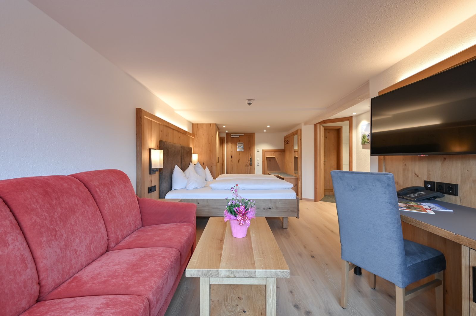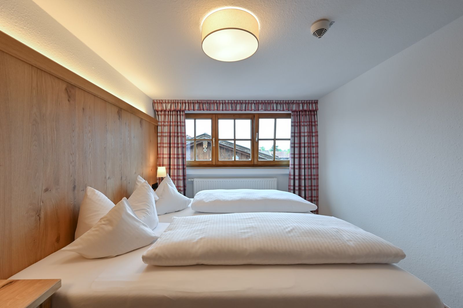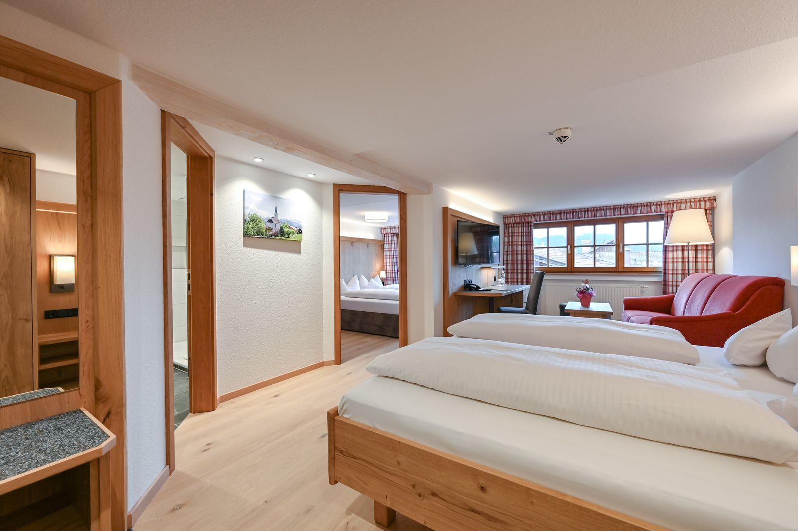 Our family room Schlicke is located in the main house, 2nd floor, has a living-bedroom and a second bedroom. With view direction southwest you see the Tannheimer mountains with the 2080 m high Schlicke.