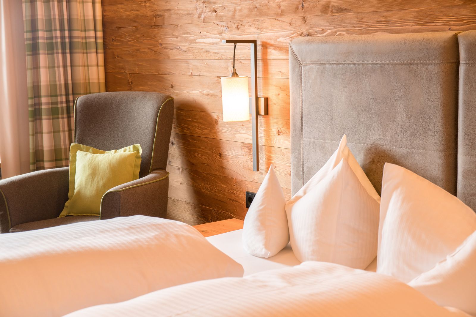 Furnished in an alpine style, the headboards are paneled with specially processed spruce wood. Facing southwest, you have a view of both the Neuschwanstein and the Hohenschwangau Castles, as well as of the Schwangau and Tyrolean mountains.